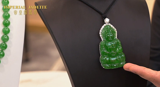 翡翠以绿色为尊,当中以色泽浓润的「帝皇绿」为翡翠中最高级别,帝皇绿翡翠级别原已十分稀有,种、水及色都至臻完美,配合精湛雕琢工艺,成就名副其实翡翠中的极品。